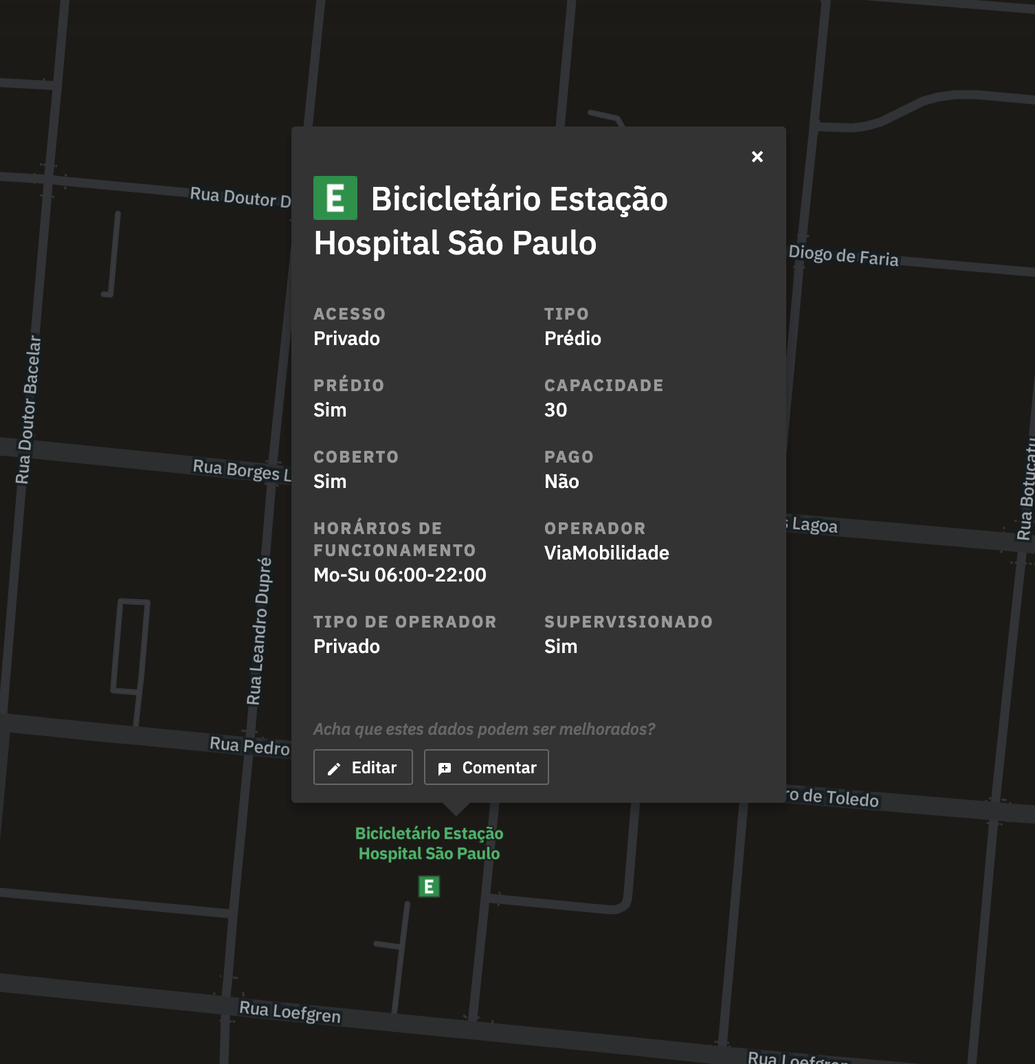 The bike paths have a special, colorful tooltip. On the bottom, buttons invite the user to quickly edit that data in the OSM official website, or to leave a comment inside CicloMapa.