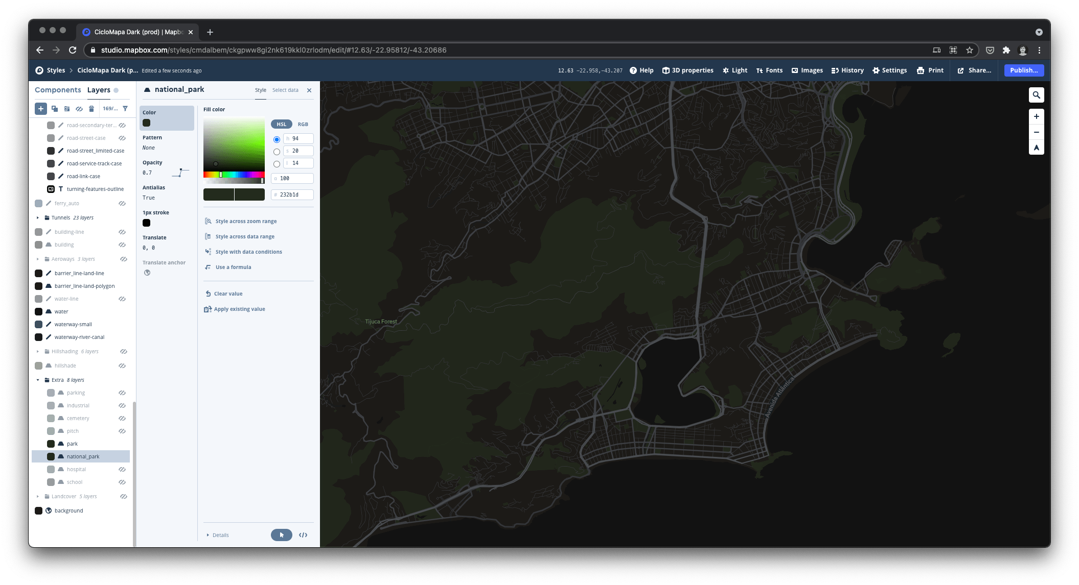 With the typography and basic palette set, I started customizing the Mapbox base map and the Ant Design components to match the style. Mapbox Studio is a formidable tool with very advanced features for customizing the interactive map that’d be used as the base layer, going way beyond colors and line widths to advanced data filters.