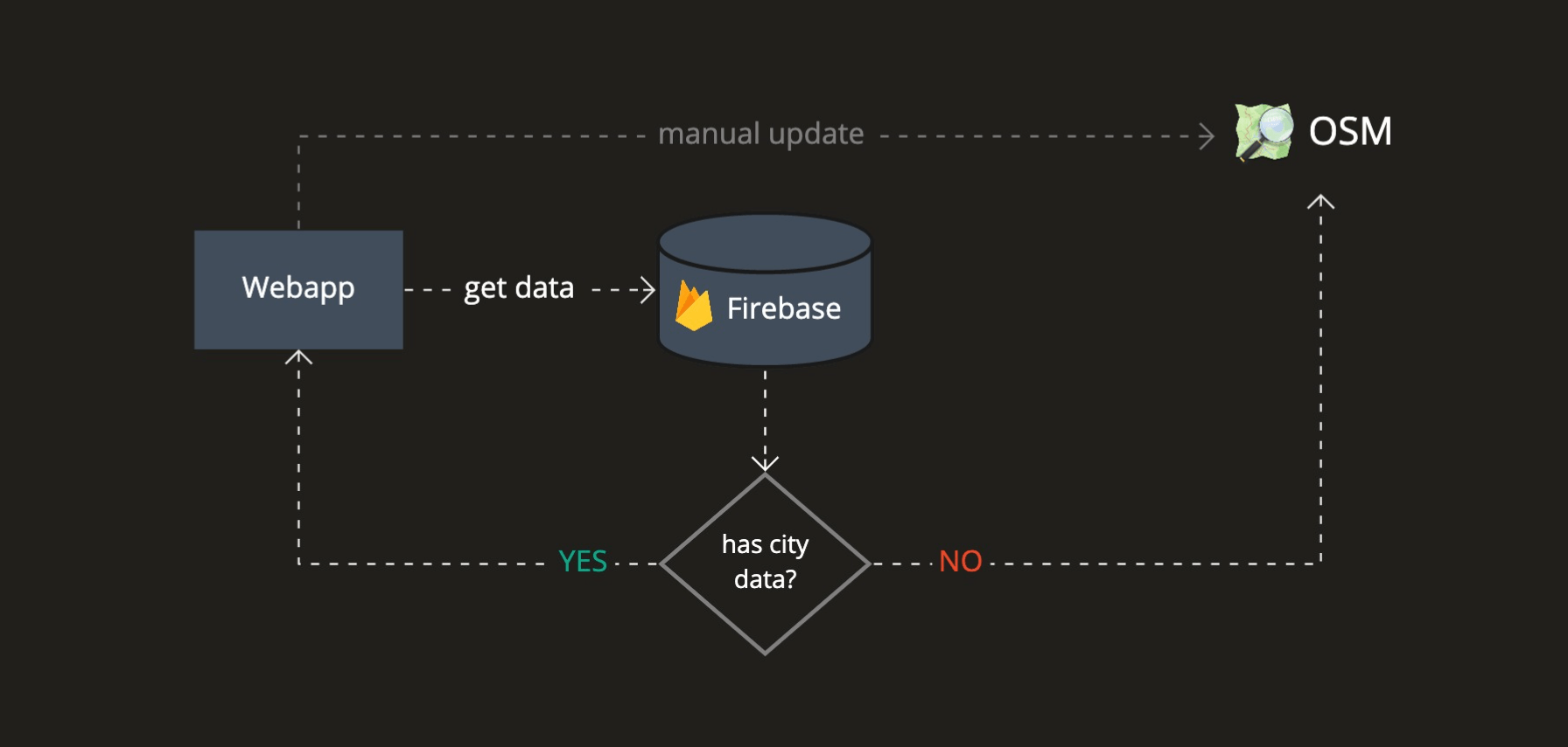 The overall system architecture passed by many iterations. I started with straightforward ones to test concepts concerning the OSM Overpass API. I slowly added more complexity to mitigate the problems we saw, getting feedback from the stakeholders and our user community and always aiming to improve the user experience.