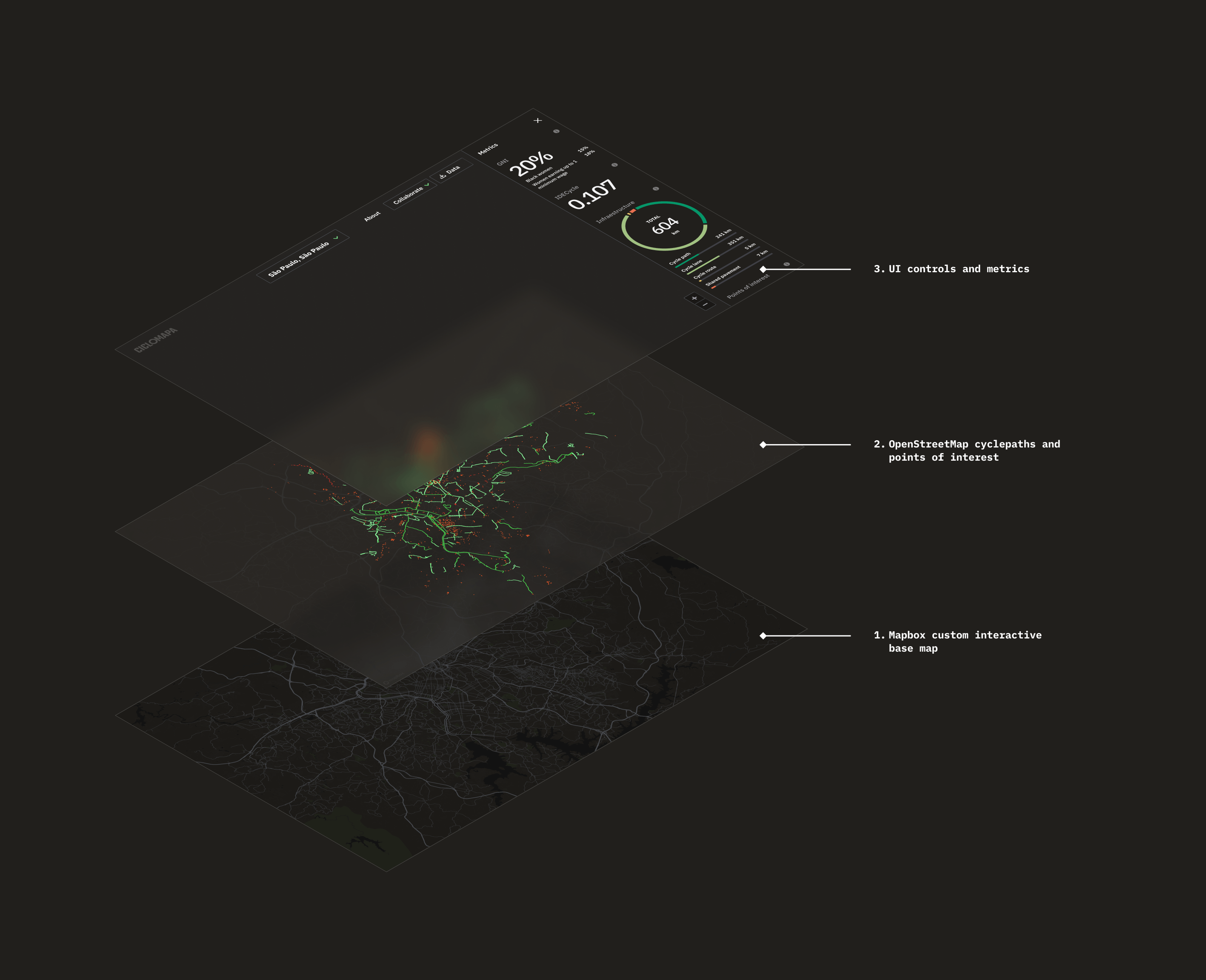 A simplified view of how the webapp is composed by 3 layers: the Mapbox interactive base map, the OSM data and the UI for controls and metrics.